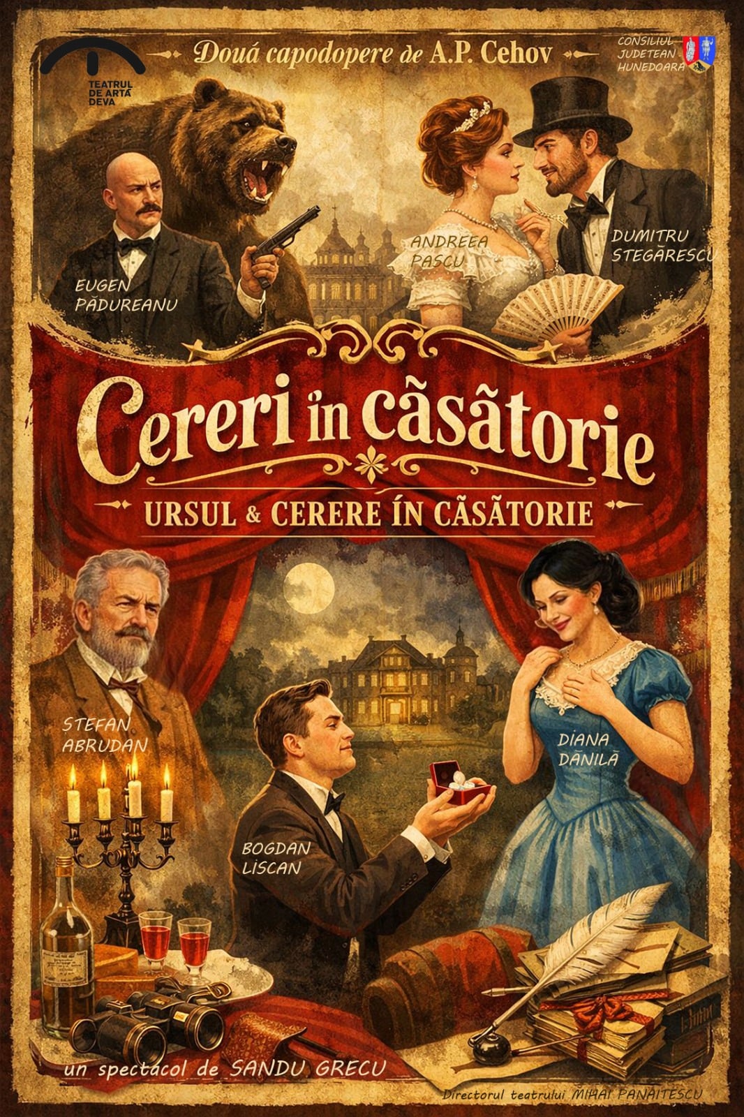 CERERI ÎN CĂSĂTORIE, un spectacol 16+, care ne duce în universul lui Cehov, cel ce ne arată că dragostea nu începe niciodată în liniște. Ea izbucnește în ceartă, în orgoliu, în ridicol și în acea formă tandră de nebunie pe care oamenii o numesc viață.